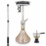 Dum SS41 Grande 2.0 Waterpijp met zijn eigen ontwerp heeft de SS41 Grande 2.0 een gedegradeerde stijl. Zijn rookkolom biedt originaliteit in al zijn pracht. Deze Waterpijp heeft een kolom van roestvrije die bij de vaas past. Hier vinden we een zeer glanzende vaas, een handvat en een siliconenslang die past bij de kleuren van de Shisha. Onder de asbak bevind zich led strip. Dit krijg je meegeleverd.